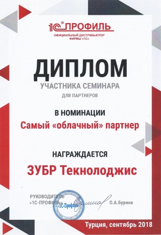 Компания ЗУБР Текнолоджис в сентябре 2018 г. получила Диплом дистрибьютора 1С-Профиль в номинации "Самый "облачный" партнер.